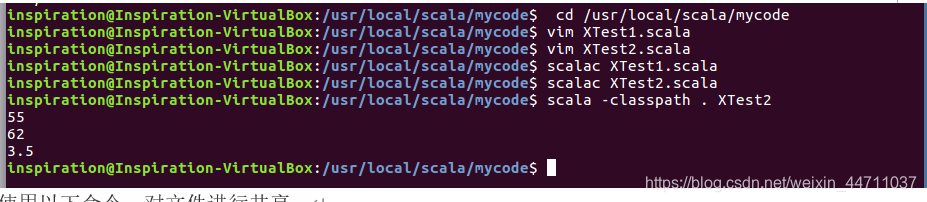vim后,分别在XTest1.scala,XTest2.scala文件中输入代码,并获得结果: