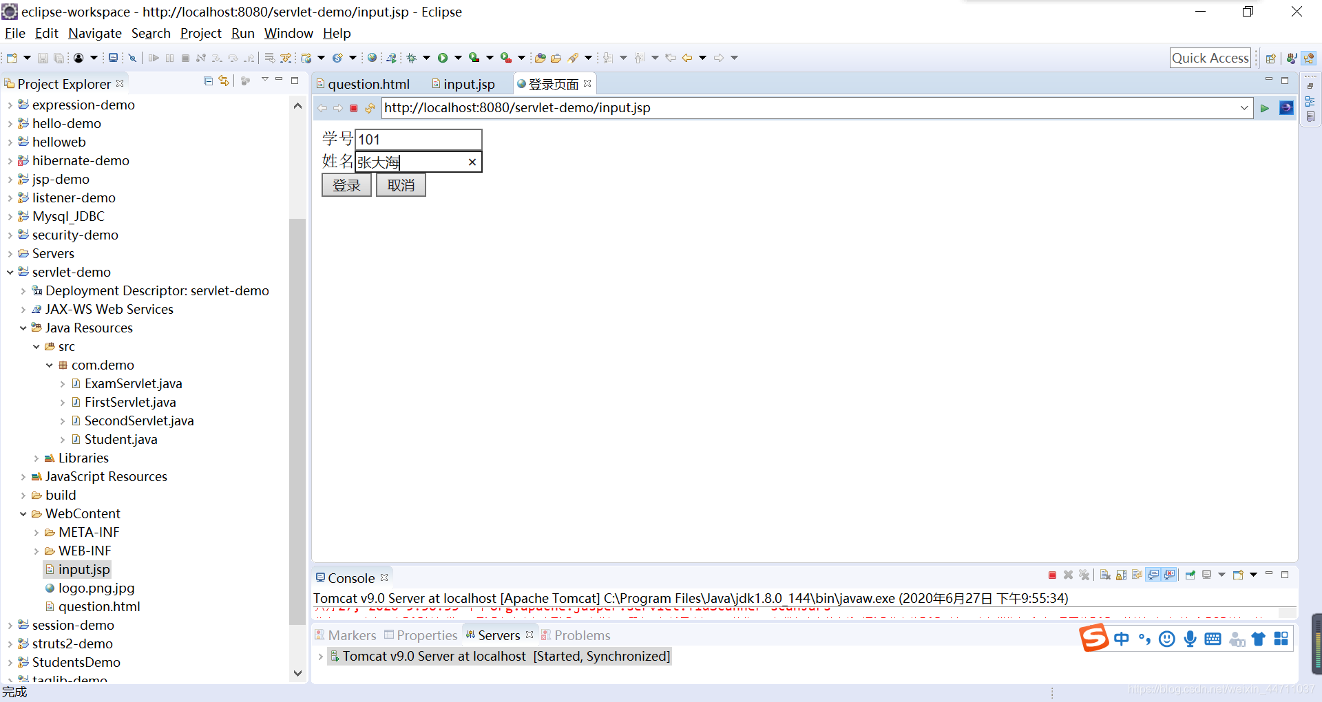 <form action = "first-servlet"method="post">学号<input type="text"name="sno"size="15"/><br>姓名<input type="text"name="sname"size="15"/><br><input type="submit"value="登录"/><input type="reset"value="取消"/>