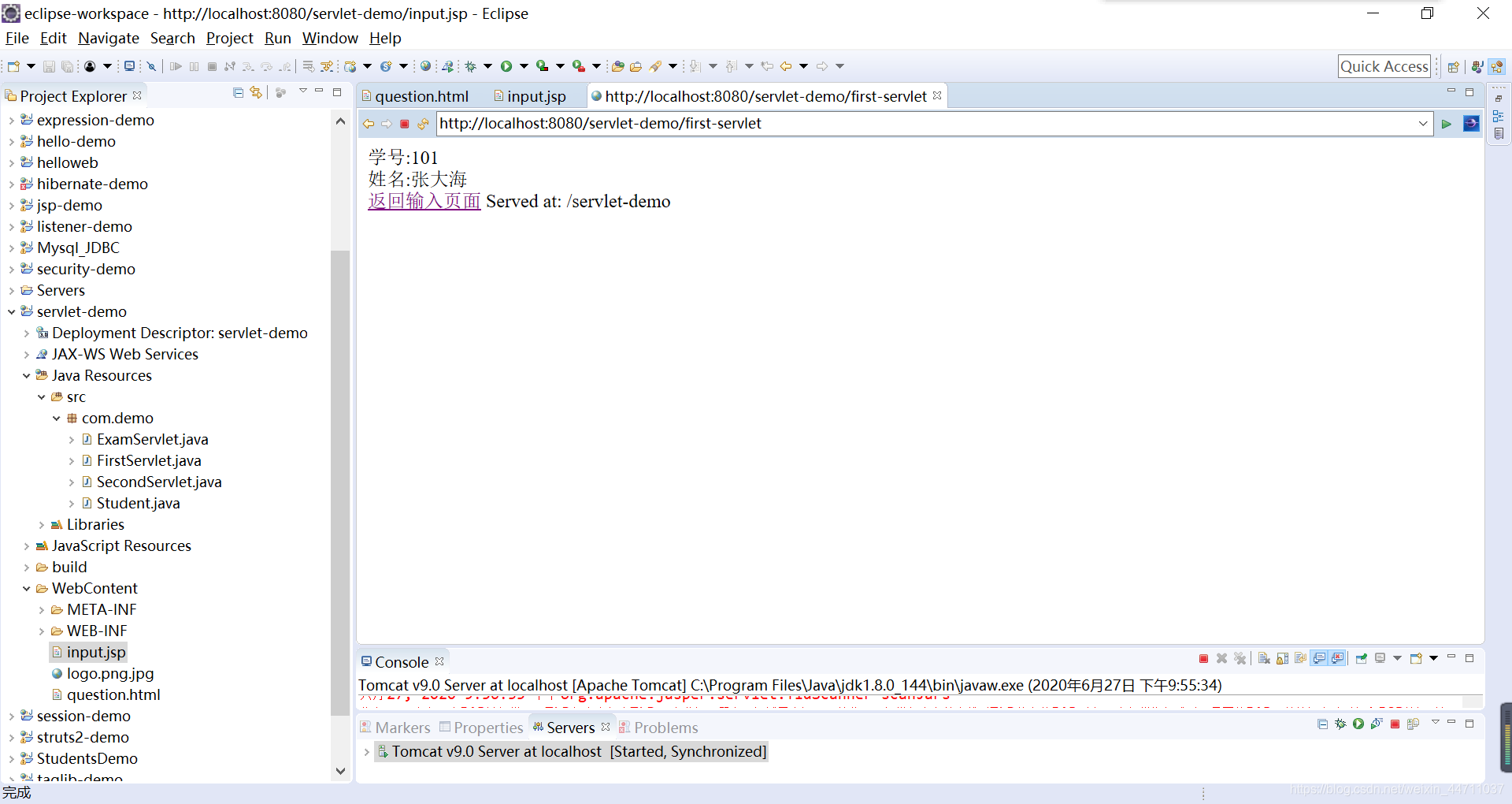 public class SecondServlet extends HttpServlet {private static final long serialVersionUID = 1L;/*** @see HttpServlet#HttpServlet()*/public SecondServlet() {super();// TODO Auto-generated constructor stub}/*** @see HttpServlet#doGet(HttpServletRequest request, HttpServletResponse response)*/protected void doGet(HttpServletRequest request, HttpServletResponse response) throws ServletException, IOException {// TODO Auto-generated method stubresponse.getWriter().append("Served at: ").append(request.getContextPath());}/*** @see HttpServlet#doPost(HttpServletRequest request, HttpServletResponse response)*/protected void doPost(HttpServletRequest request, HttpServletResponse response) throws ServletException, IOException {Student student = (Student)request.getAttribute("student");response.setContentType("text/html;charset=UTF-8");PrintWriter out = response.getWriter();out.println("学号:"+student.getSno()+"<br>");out.println("姓名:"+new String(student.getName().getBytes("iso-8859-1"),"UTF-8")+"<br>");out.println("<a href='input.jsp'>返回输入页面</a>");// TODO Auto-generated method stubdoGet(request, response);}}