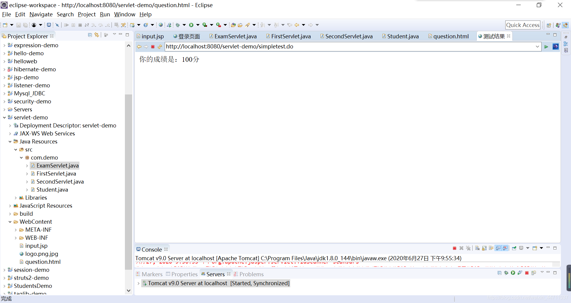 public class ExamServlet extends HttpServlet {private static final long serialVersionUID = 1L;/*** Default constructor. */public ExamServlet() {// TODO Auto-generated constructor stub}/*** @see HttpServlet#doGet(HttpServletRequest request, HttpServletResponse response)*/protected void doGet(HttpServletRequest request, HttpServletResponse response) throws ServletException, IOException {// TODO Auto-generated method stubresponse.getWriter().append("Served at: ").append(request.getContextPath());}/*** @see HttpServlet#doPost(HttpServletRequest request, HttpServletResponse response)*/protected void doPost(HttpServletRequest request, HttpServletResponse response) throws ServletException, IOException {response.setContentType("text/html;charset=UTF-8");PrintWriter out = response.getWriter();String quest1 = request.getParameter("q1");//获得表单提交的参数String quest2 = request.getParameter("q2").trim();String[] quest3 = request.getParameterValues("q3");//获得表单提交的所有参数String quest4 = request.getParameter("q4");int score = 0;if(quest1!=null && quest1.equals("3")) {score = score+25;//答对一题加25分}if(quest2!=null && quest2.equals("HttpServlet")||quest2.equals("javax.servlet.http.HttpServlet")) {score = score+25;//答对一题加25分}if(quest3!=null && quest3.length==2 && quest3[0].equals("1")&&quest3[1].equals("3")) {score = score+25;//答对一题加25分}if(quest4!=null && quest4.equals("3")) {score = score+25;//答对一题加25分}out.println("<html><head>");out.println("<title>测试结果</title>");out.println("</head><body>");out.println("你的成绩是:"+score+"分");out.println("</body></html>");// TODO Auto-generated method stub//doGet(request, response);}}