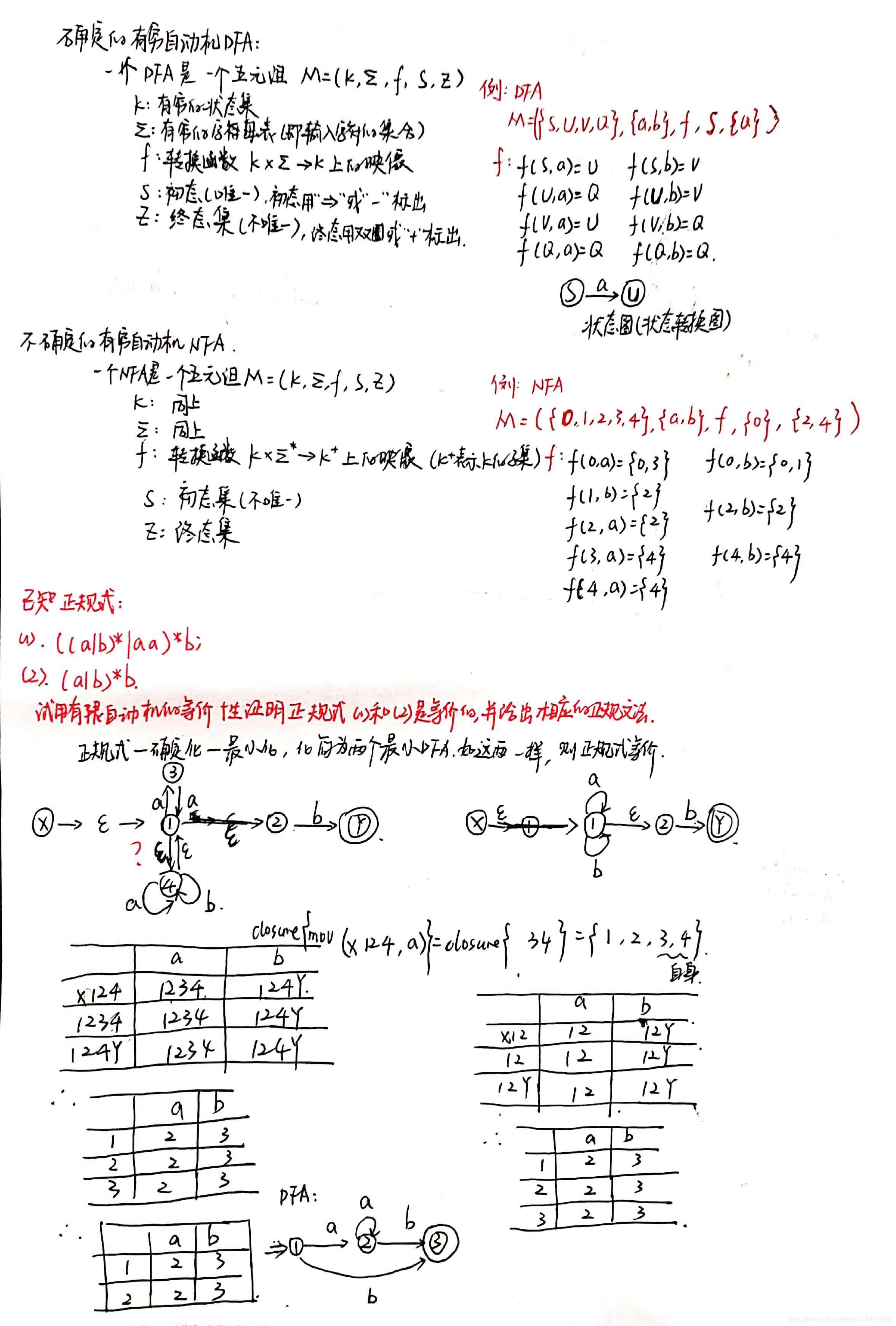 - DFA:给出一句描述语言,已经写出正规式。比如0和1构成的串。通过正规式画出DFA。来自第三章词法分析的重点。