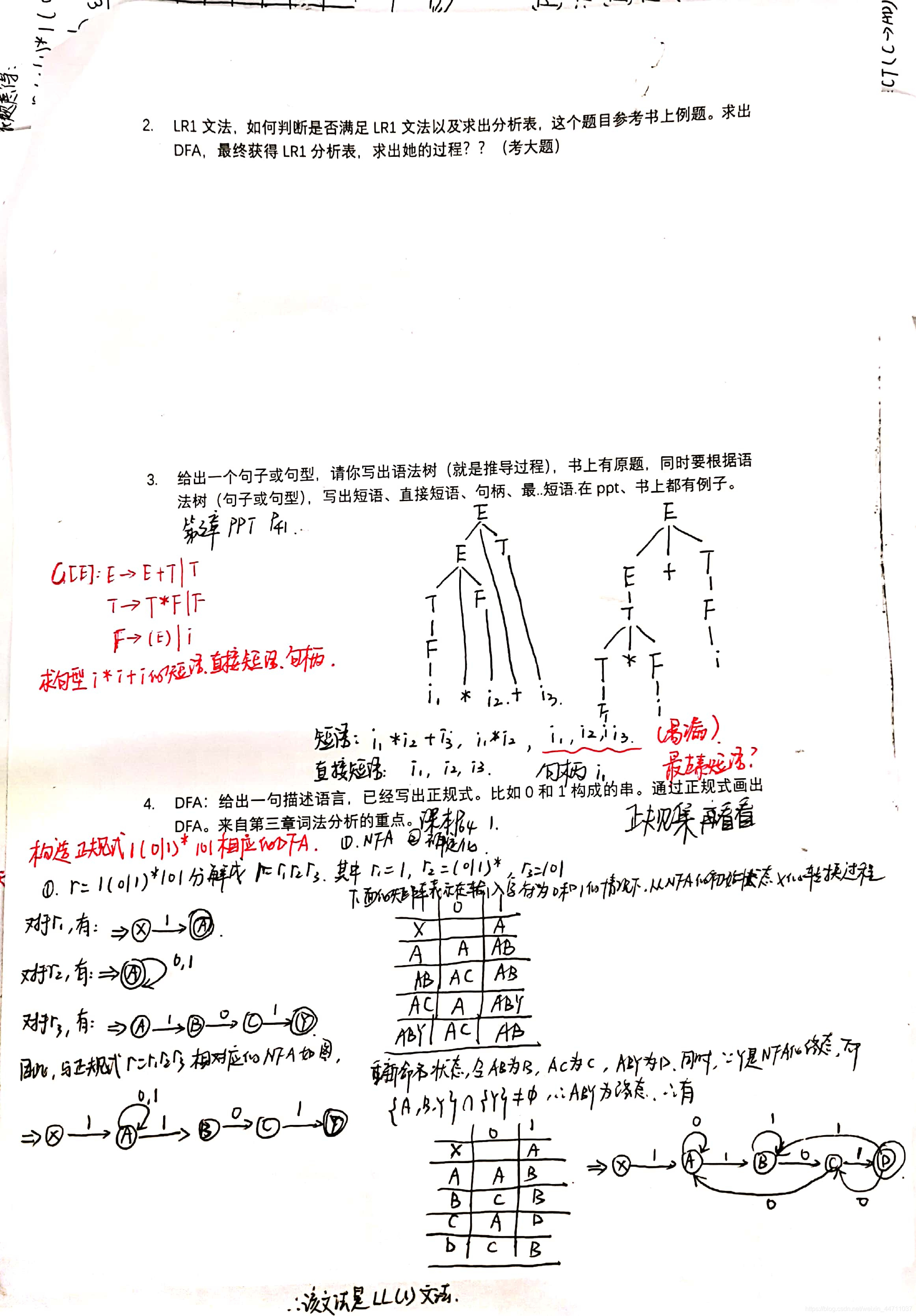 - 给出一个句子或句型,请你写出语法树(就是推导过程),书上有原题,同时要根据语法树(句子或句型),写出短语、直接短语、句柄、最..短语.在ppt、书上都有例子。