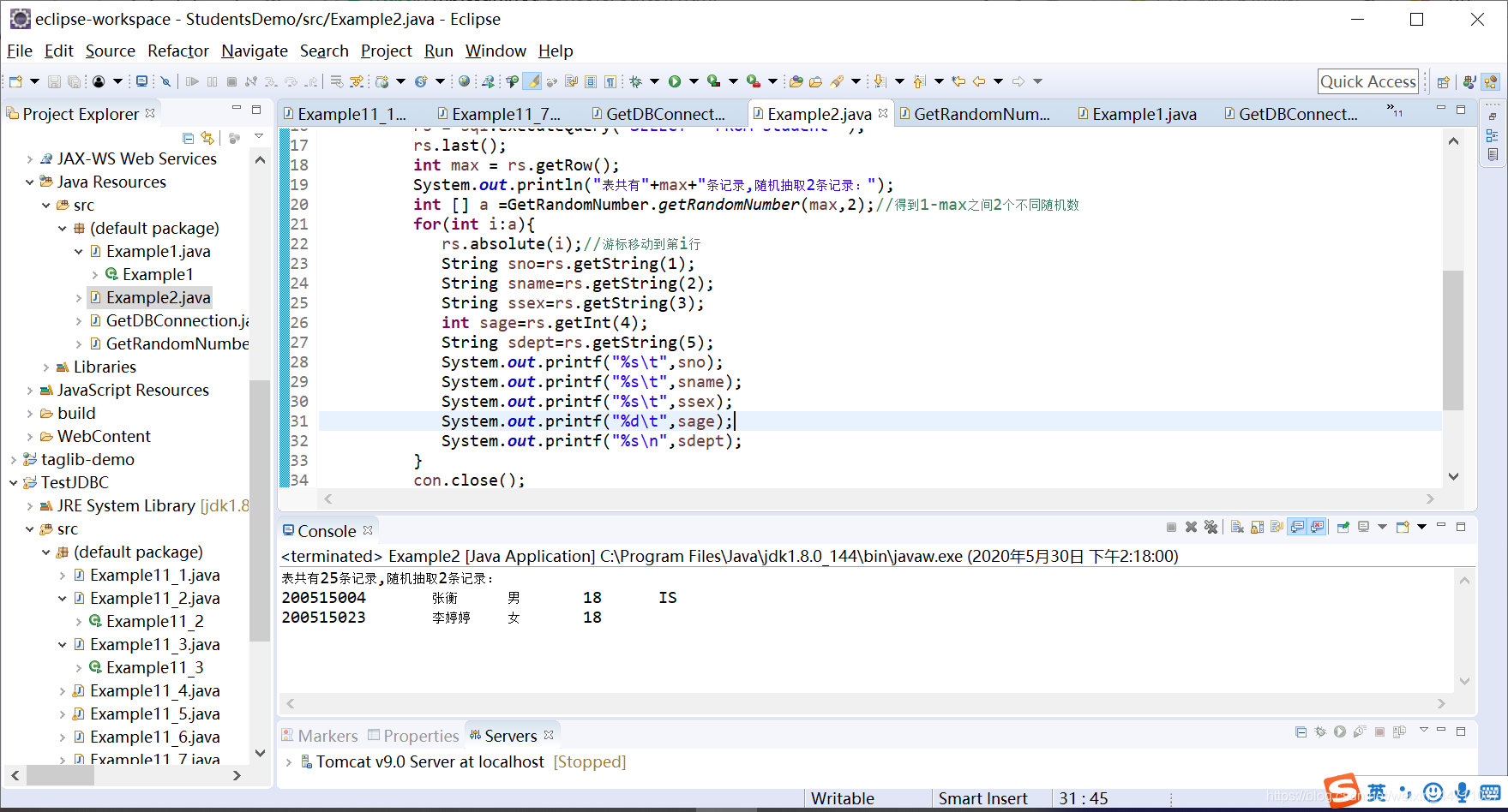 public class Example2 {public static void main(String args[]) {Connection con;Statement sql; ResultSet rs;con = GetDBConnection.connectDB("EDUC","root","");if(con == null ) return;try { sql=con.createStatement(ResultSet.TYPE_SCROLL_SENSITIVE,//为了得到一个可滚动的结果集ResultSet.CONCUR_READ_ONLY);rs = sql.executeQuery("SELECT * FROM student ");rs.last();int max = rs.getRow();System.out.println("表共有"+max+"条记录,随机抽取2条记录:");int [] a =GetRandomNumber.getRandomNumber(max,2);//得到1-max之间2个不同随机数for(int i:a){rs.absolute(i);//游标移动到第i行String sno=rs.getString(1);String sname=rs.getString(2);String ssex=rs.getString(3);int sage=rs.getInt(4);String sdept=rs.getString(5);System.out.printf("%s\t",sno);System.out.printf("%s\t",sname);System.out.printf("%s\t",ssex); System.out.printf("%d\t",sage);System.out.printf("%s\n",sdept);}con.close();}catch(SQLException e) { System.out.println(e);}}