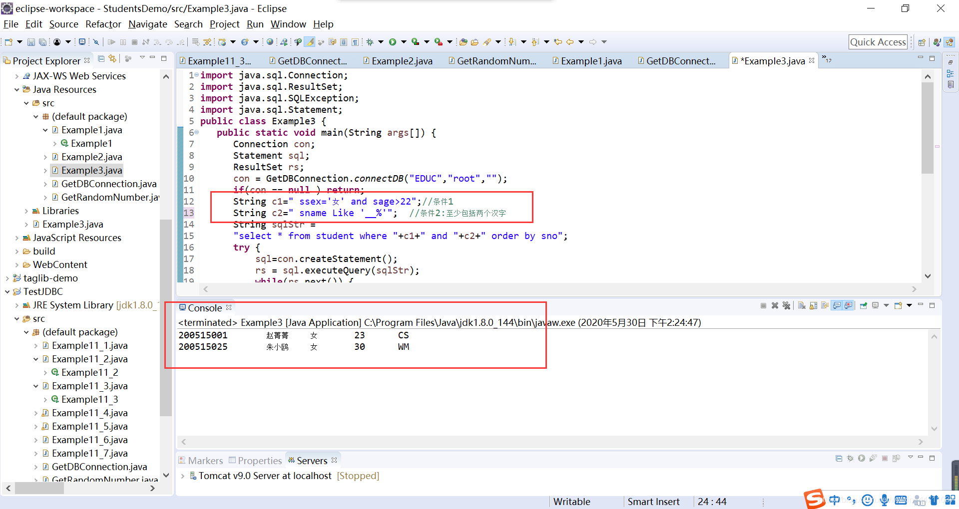 public class Example3 {public static void main(String args[]) {Connection con;Statement sql; ResultSet rs;con = GetDBConnection.connectDB("EDUC","root","");if(con == null ) return;String c1=" ssex='女' and sage>22";//条件1String c2=" sname Like '__%'"; //条件2:至少包括两个汉字 String sqlStr ="select * from student where "+c1+" and "+c2+" order by sno";try { sql=con.createStatement();rs = sql.executeQuery(sqlStr);while(rs.next()) { String sno=rs.getString(1);String sname=rs.getString(2);String ssex=rs.getString(3);int sage=rs.getInt(4);String sdept=rs.getString(5);System.out.printf("%s\t",sno);System.out.printf("%s\t",sname);System.out.printf("%s\t",ssex); System.out.printf("%d\t",sage);System.out.printf("%s\n",sdept);}con.close();}catch(SQLException e) { System.out.println(e);}}