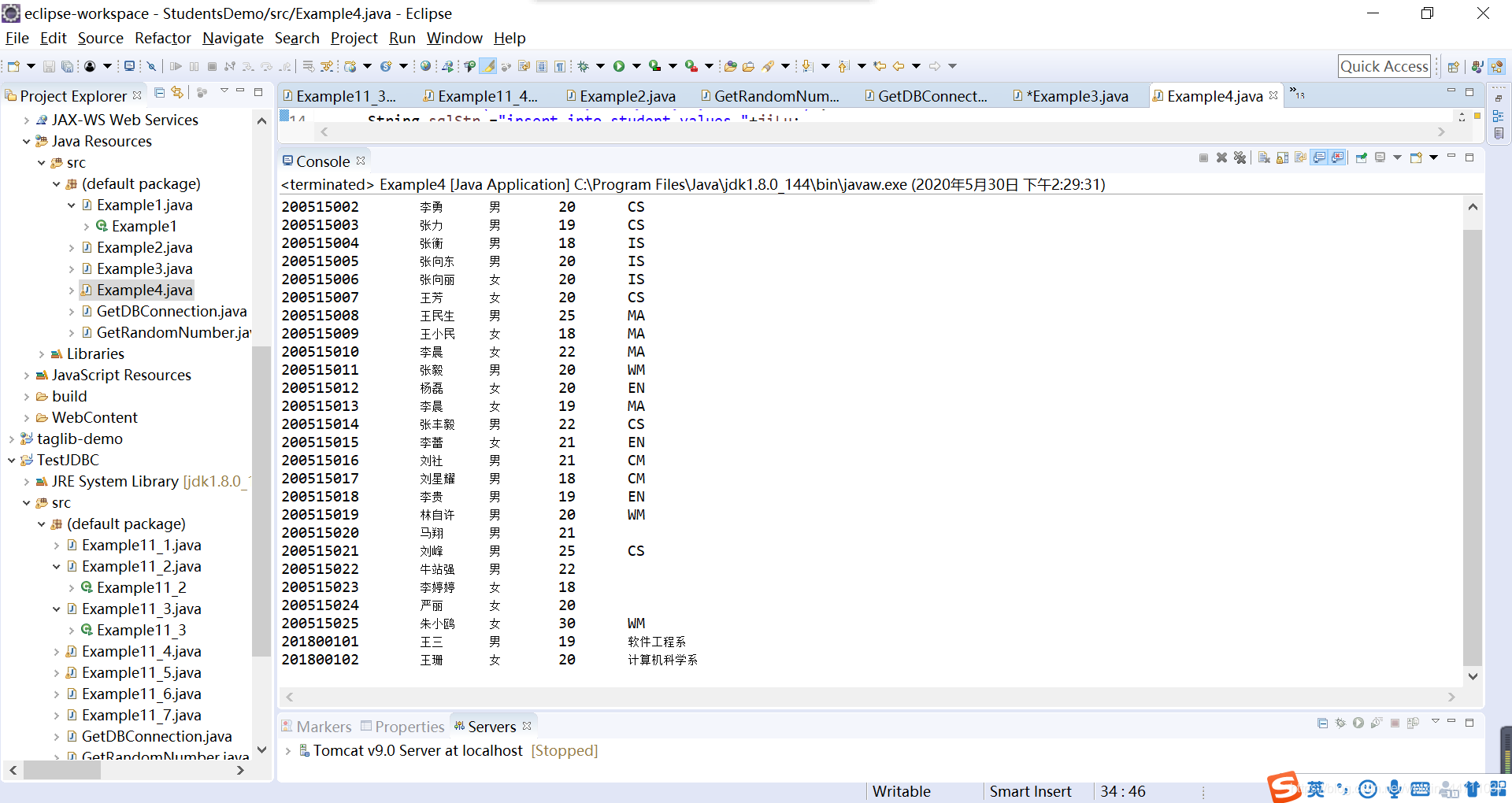public class Example4 {public static void main(String args[]) {Connection con;Statement sql; ResultSet rs;con = GetDBConnection.connectDB("EDUC","root","");if(con == null ) return;String jiLu="('201800101','王三','男',19, '软件工程系'),"+"('201800102','王珊','女',20, '计算机科学系')"; //2条记录String sqlStr ="insert into student values "+jiLu;try { sql=con.createStatement(); int ok = sql.executeUpdate(sqlStr);rs = sql.executeQuery("select * from student");while(rs.next()) { String sno=rs.getString(1);String sname=rs.getString(2);String ssex=rs.getString(3);int sage=rs.getInt(4);String sdept=rs.getString(5);System.out.printf("%s\t",sno);System.out.printf("%s\t",sname);System.out.printf("%s\t",ssex); System.out.printf("%d\t",sage);System.out.printf("%s\n",sdept);}con.close();}catch(SQLException e) { System.out.println("记录中sno值不能重复"+e);}}