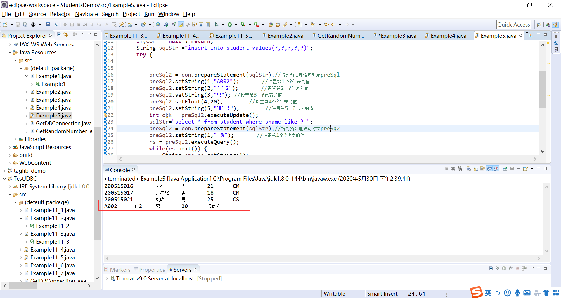 Example5 中使用预处理语句向student表添加记录并查询了姓刘的记录