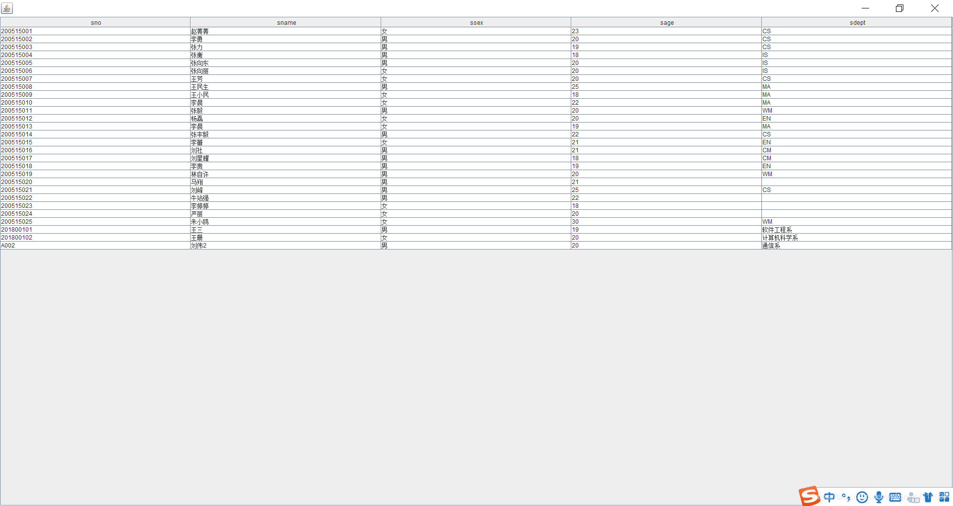 public class Example1 {public static void main(String[] args) {Connection con=null;Statement sql; ResultSet rs;try{ Class.forName("com.mysql.jdbc.Driver"); //加载JDBC_MySQL驱动}catch(Exception e){}String uri = "jdbc:mysql://localhost:3308/EDUC?user=root&password=&useSSL=true&characterEncoding=utf-8";String user ="root";String password ="";try{ con = DriverManager.getConnection(uri,user,password); //连接代码}catch(SQLException e){ }try { sql=con.createStatement();rs=sql.executeQuery("SELECT * FROM student"); //查询student表while(rs.next()) {String sno=rs.getString(1);String sname=rs.getString(2);String ssex=rs.getString(3);int sage=rs.getInt(4);String sdept=rs.getString(5);System.out.printf("%s\t",sno);System.out.printf("%s\t",sname);System.out.printf("%s\t",ssex); System.out.printf("%d\t",sage);System.out.printf("%s\n",sdept);}con.close();}catch(SQLException e) { System.out.println(e);}}