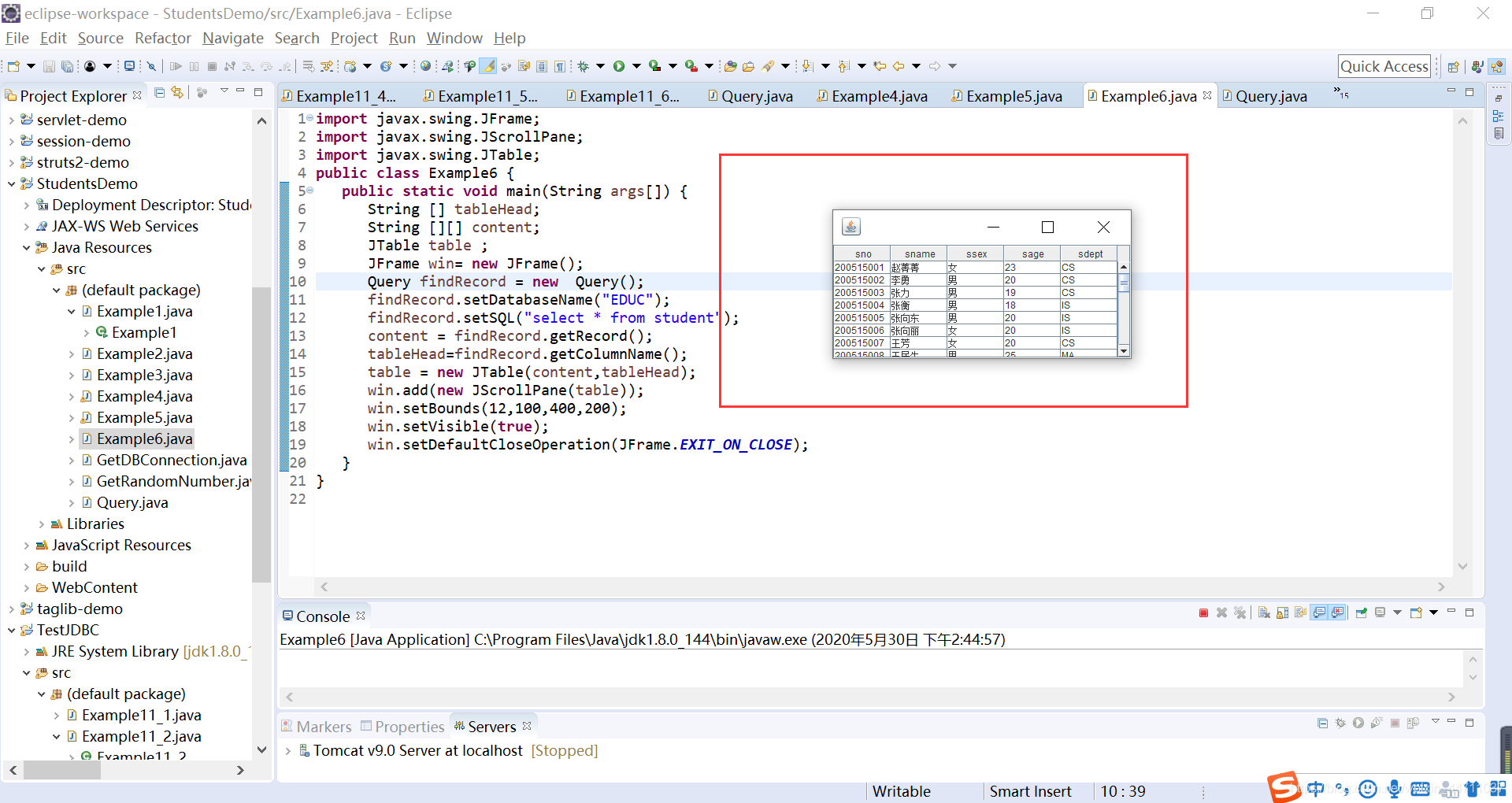 Example6 将数据库名以及SQL语句传递给Query类的对象,用表格 (JTable组件)显示查询到的记录。