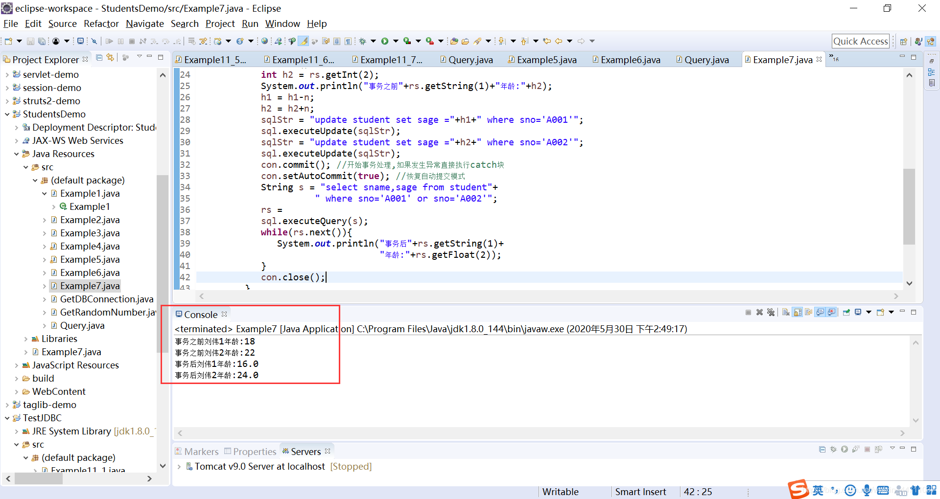 public class Example7{public static void main(String args[]){Connection con = null;Statement sql;ResultSet rs; String sqlStr;con = GetDBConnection.connectDB("EDUC","root","");if(con == null ) return;try{ int n = 2;con.setAutoCommit(false); //关闭自动提交模式sql = con.createStatement();sqlStr = "select sname,sage from student where sno='A001'";rs = sql.executeQuery(sqlStr);rs.next();int h1 = rs.getInt(2);System.out.println("事务之前"+rs.getString(1)+"年龄:"+h1);sqlStr = "select sname,sage from student where sno='A002'"; rs = sql.executeQuery(sqlStr);rs.next();int h2 = rs.getInt(2);System.out.println("事务之前"+rs.getString(1)+"年龄:"+h2); h1 = h1-n;h2 = h2+n;sqlStr = "update student set sage ="+h1+" where sno='A001'";sql.executeUpdate(sqlStr);sqlStr = "update student set sage ="+h2+" where sno='A002'";sql.executeUpdate(sqlStr);con.commit(); //开始事务处理,如果发生异常直接执行catch块con.setAutoCommit(true); //恢复自动提交模式String s = "select sname,sage from student"+" where sno='A001' or sno='A002'";rs = sql.executeQuery(s);while(rs.next()){System.out.println("事务后"+rs.getString(1)+"年龄:"+rs.getFloat(2)); }con.close();}catch(SQLException e){try{ con.rollback(); //撤销事务所做的操作}catch(SQLException exp){}}}