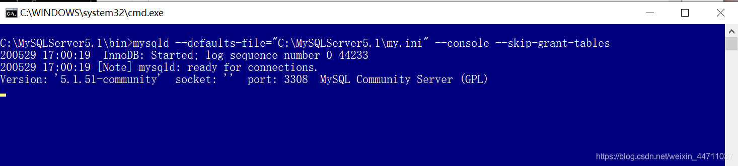 网络课堂中共享的MySQL 5.1压缩包下载后,直接在C盘根目录下解压后, 进入bin目录,执行“启动服务.cmd”即可启动服务器(如果未放在C盘根目 录下,需要修改配置文件my.ini和启动服务.cmd)。 注意:使用MySQL期间不可关闭本窗口。可使用Ctrl+C关闭MySQL服务器。