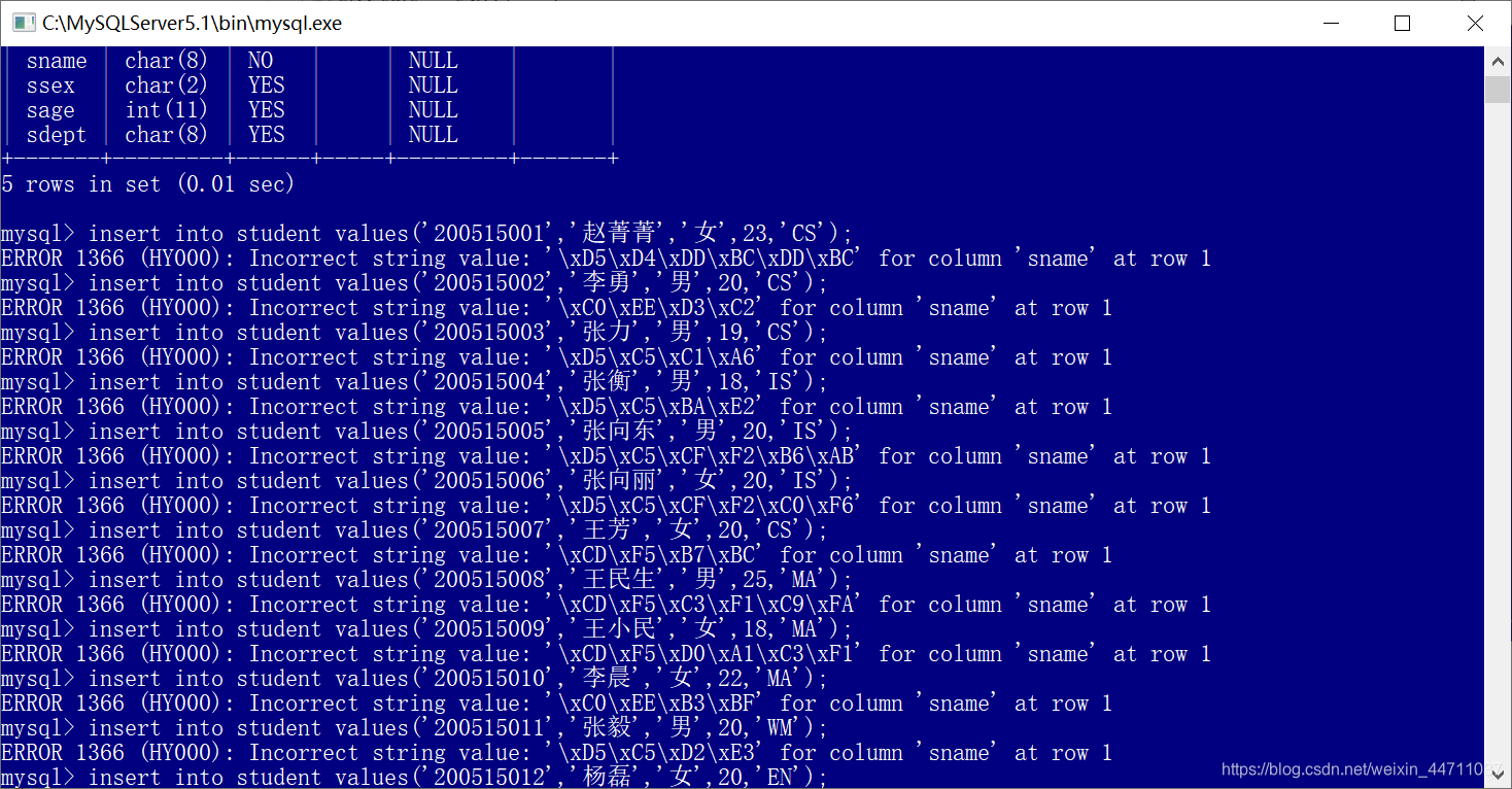 ERROR 1366 (HY000): Incorrect string value: '\xC5\xAE' for column 'sex' at row 1