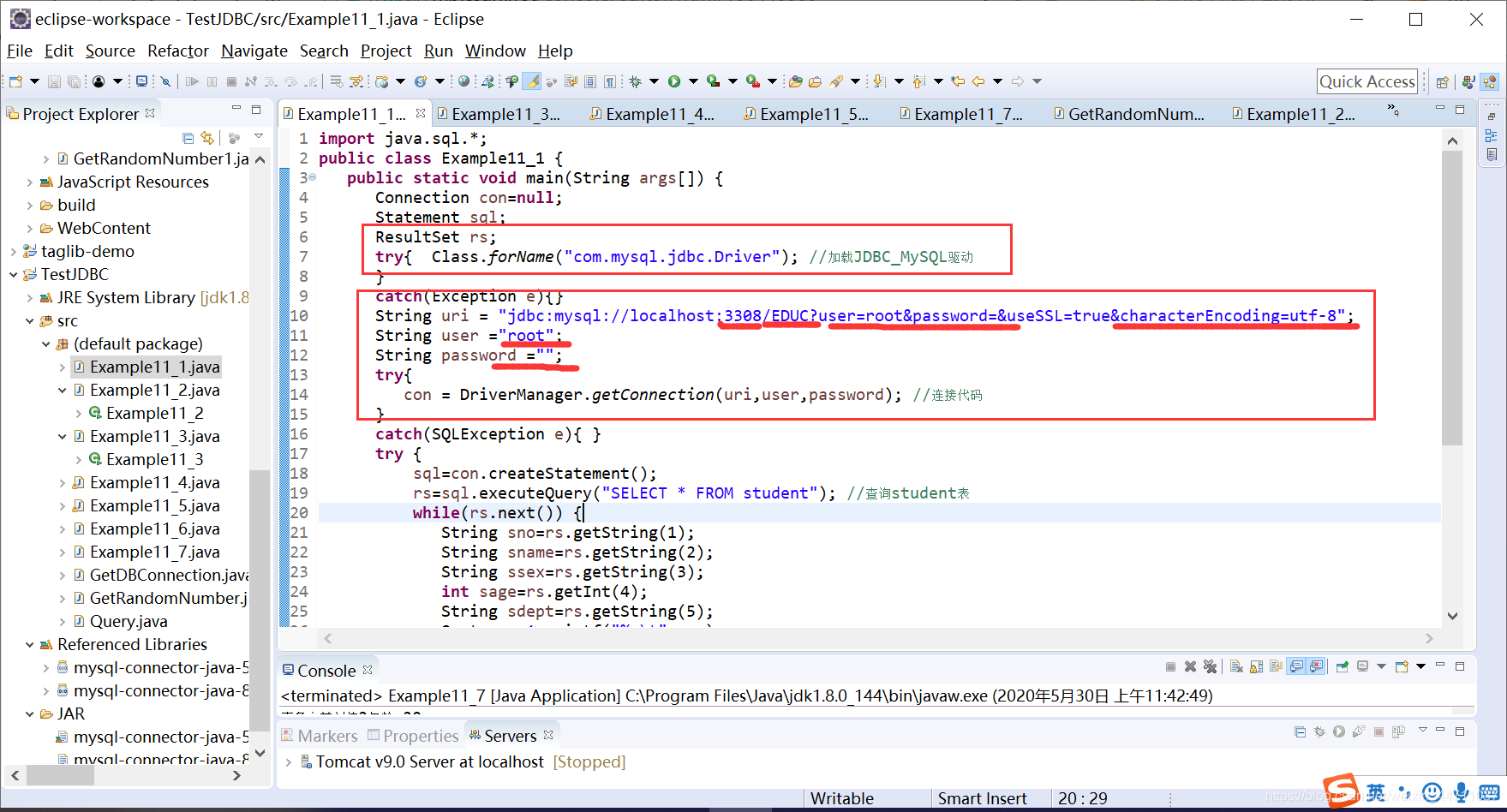 String uri = "jdbc:mysql://192.168.100.1:3306/students?user=root&password=&useSSL=true"; try{ con = DriverManager.getConnection(uri); //连接代码 } catch(SQLException e){ System.out.println(e); }