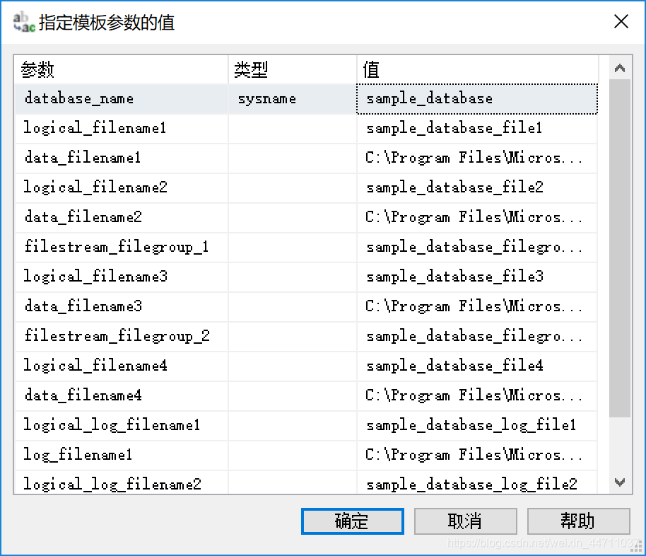 (3)在出现的“指定模板参数的值”对话框中,显示了当前模板中存在的参数、类型和值3列。在此输入相关设置,单击“确定”完成对脚本的编辑。