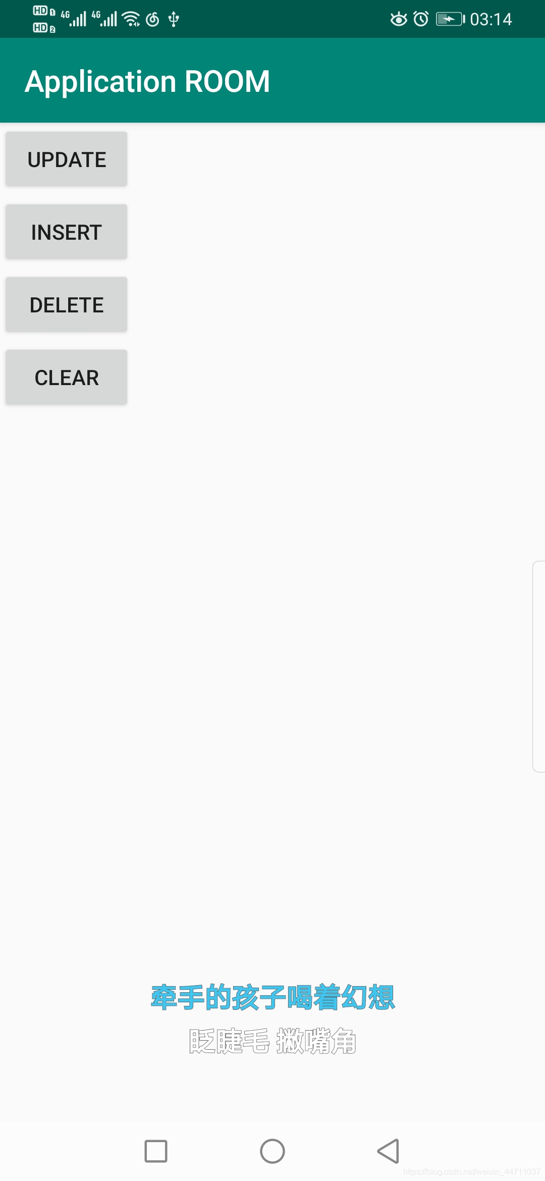 import androidx.room.Room;import java.util.List;public class MainActivity extends AppCompatActivity {StudentDatabase studentDatabase;StudentDao studentDao;TextView textView;Button buttonInsert,buttonUpdate,buttonDelete,buttonClear;@Overrideprotected void onCreate(Bundle savedInstanceState) {super.onCreate(savedInstanceState);setContentView(R.layout.activity_main);textView = findViewById(R.id.textView);// allowMainThreadQueries() 强制允许在主线程执行,真实开发中不要这么做//studentDatabase = StudentDatabase.getsInstance(this);//studentDao = studentDatabase.studentDao();// allowMainThreadQueries() 强制允许在主线程执行,真实开发中不要这么做studentDatabase = Room.databaseBuilder(this,StudentDatabase.class,"word_database").allowMainThreadQueries().build();studentDao = studentDatabase.getStudentDao();updateView();buttonInsert = findViewById(R.id.buttonInsert);buttonUpdate = findViewById(R.id.buttonUpdate);buttonDelete = findViewById(R.id.buttonDelete);buttonClear = findViewById(R.id.buttonClear);buttonInsert.setOnClickListener(new View.OnClickListener() {@Overridepublic void onClick(View view) {Student student1 = new Student(1,"吴美丽");Student student2 = new Student(2,"张漂亮");studentDao.insertStudents(student1,student2);updateView();}});buttonClear.setOnClickListener(new View.OnClickListener() {@Overridepublic void onClick(View view) {studentDao.deleteAllStudents();updateView();}});buttonUpdate.setOnClickListener(new View.OnClickListener() {@Overridepublic void onClick(View view) {Student student3= new Student(3,"马可爱");studentDao.updateStudents(student3);updateView();}});buttonDelete.setOnClickListener(new View.OnClickListener() {@Overridepublic void onClick(View view) {Student student = new Student(0,"");studentDao.deleteStudents(student);updateView();}});}void updateView(){List<Student> list = studentDao.getAllStudents();String text = "";for(int i = 0; i < list.size(); i++){Student student= list.get(i);text += student.getId() + ":" + student.getName() + "\n";}textView.setText(text);}