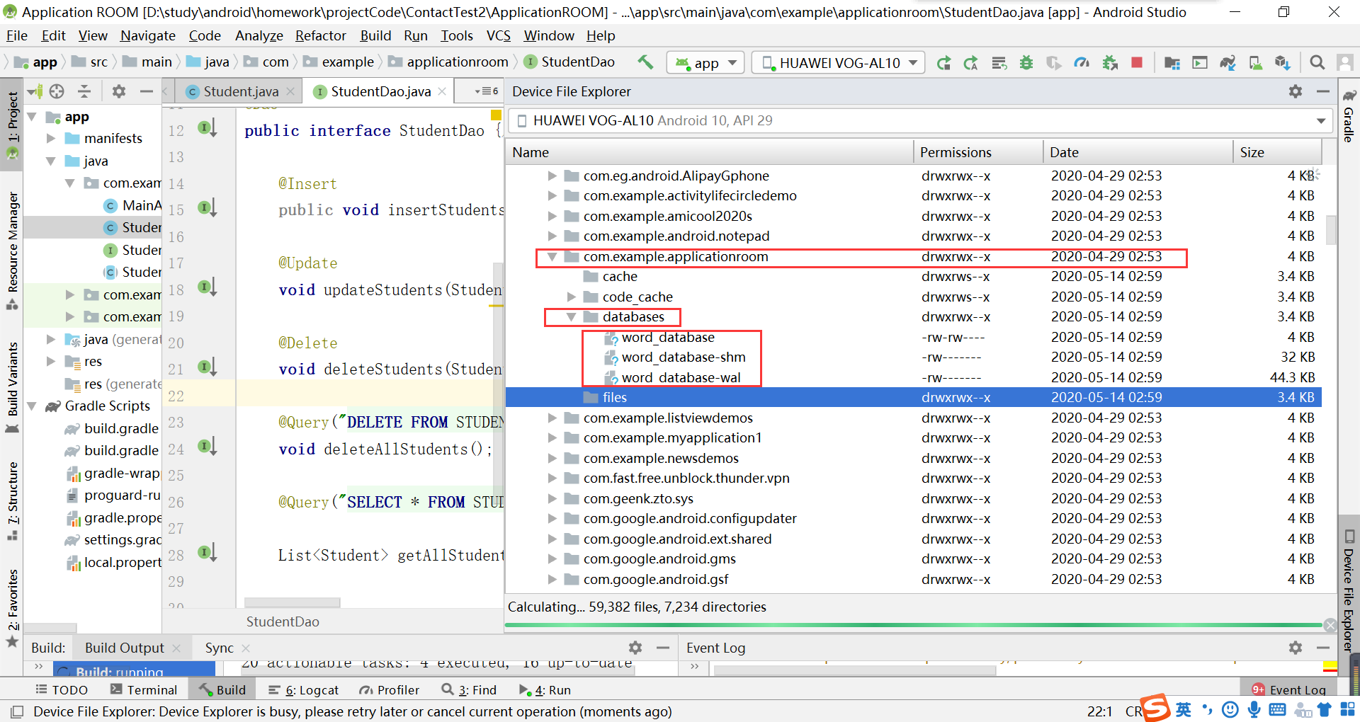 public interface StudentDao {// 在这里声明数据库的操作,如增删改查@Insertpublic void insertStudents(Student...students);// 可以传递三个参数@Updatevoid updateStudents(Student...students);@Deletevoid deleteStudents(Student...students);@Query("DELETE FROM STUDENT")void deleteAllStudents();@Query("SELECT * FROM STUDENT ORDER BY id ASC") // 升序排列List<Student> getAllStudents();}