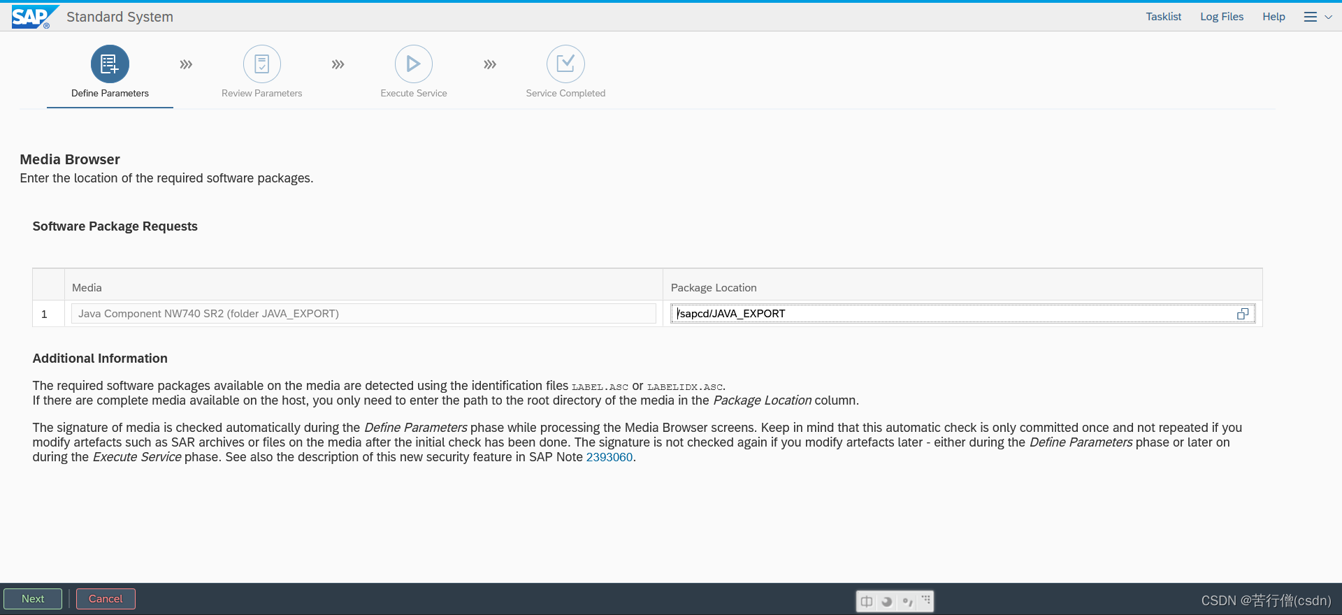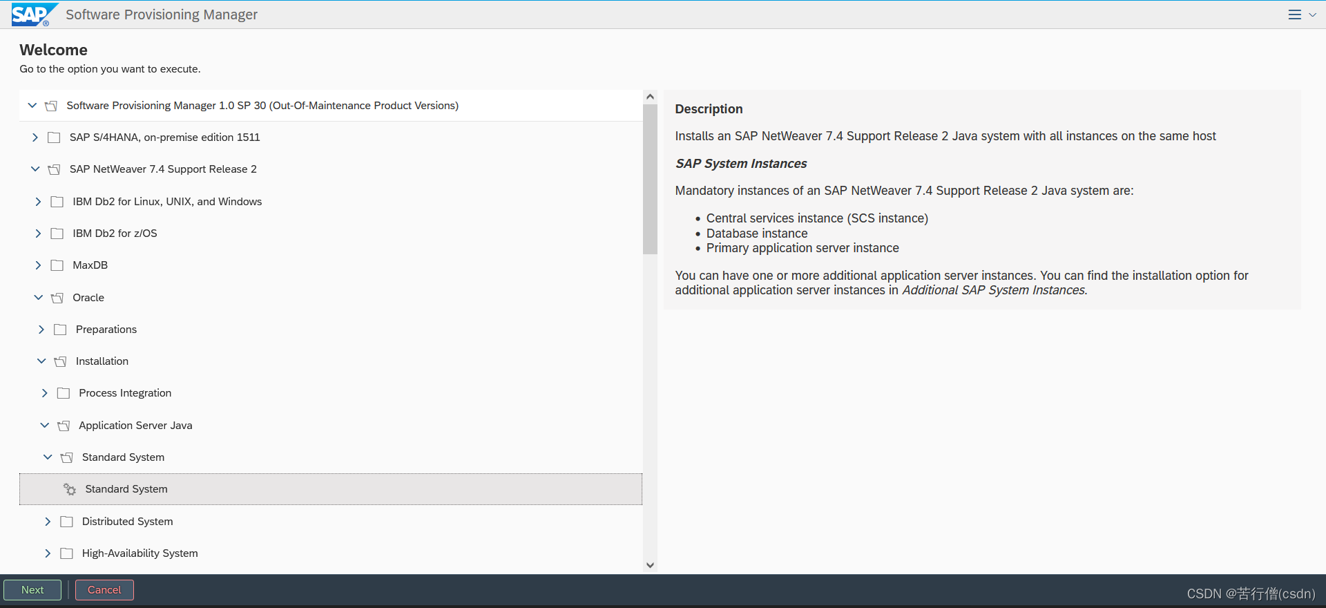 执行sapinst,打开相应的BS页面,选择 Software Provisioning Manager 1.0 SP 30 > SAP NetWeaver 7.4 Support Release 2 > Oracle > Installation > Application Server Java > Standard System > Standard System,点击Next