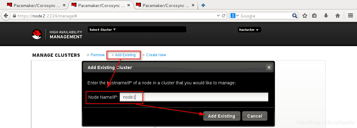 添加已有的集群,点Add Existing,因为已经配置过node1,所以填写node1添加